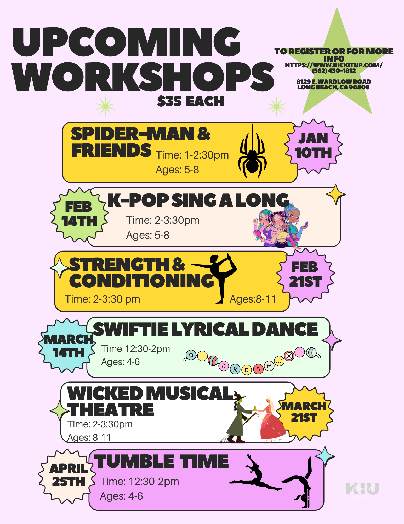 Kick It Up is bringing an exciting lineup of themed spring workshops designed for kids to move, groove, and shine! No dance shoes needed—just bring your enthusiasm! Space is limited, so secure your spot today!